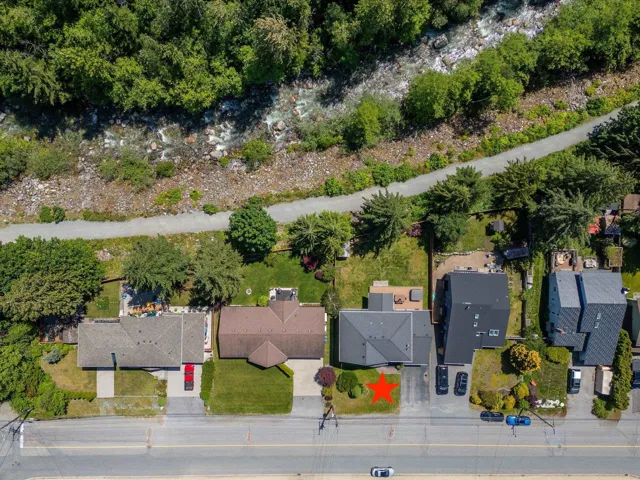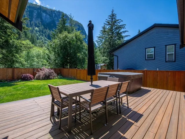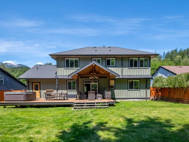 Beautiful house & rare property backing on the Stawamus River dyke trail + green space. Enjoy sounds of the river, privacy + mountain views! Spacious layout offering 5 bedrooms, 3 full baths (2 ensuites), upper level family room, flex room ideal for office + play area. Windows throughout the home offer mountain vistas. Living room w/ gas fireplace, large kitchen with deluxe appliances, gas range + window overlooking yard. Dining opens out onto the vaulted post and beam covered deck featuring built-in gas BBQ station. Walk out from main floor living space to fully fenced flat south facing yard. Such an ideal layout for indoor/outdoor living for families, pets + entertaining. Single garage, large driveway, room for RV, steps to school, trails, river. Store, café + pub a few blocks away.