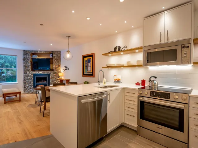 Completely renovated condo with high end finishings including heated flooring, new kitchen and bathrooms, custom millwork with smart storage features and in suite laundry. Centrally located on the slopes of Blackcomb Mountain, this beautiful condo also boasts a private, tranquil location in the complex overlooking the forest. A perfect all season location for ski in/out access, bike trails, lakes, golf courses and Whistler Village restaurants and shops. The Wildwood Lodge amenities include a large seasonal swimming pool and year round covered hot tub, secure underground parking and a personal storage locker for bikes and skis. Turnkey and fully furnished, this property is ready for immediate enjoyment with flexible zoning allowing for nightly rentals or full time personal use. GST paid.