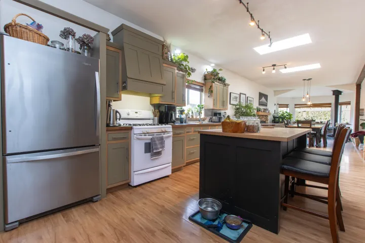 This 1600sf, 3 bdrm home sits on a beautifully landscaped,12,000sf park-like property in a quiet, child, friendly neighbourhood. The home was extensively renovated in 2007 to create a spacious living room with 10′ ceilings, a wall of windows looking out to the amazing garden & wrap-around deck. The dining room will host a crowd & is warmed by a gas f/p & new energy efficient wood stove. The kitchen features a large butcher block island, wood cabinets & w/in pantry. The family bathroom has a soaker tub & a one of a kind shower. Storage & extra work space is easily accommodated in the 14′ x 20′ shop & there is plenty of parking on the 90′ driveway. This is a home & property that will impress everyone; the first time home owner, family, enthusiastic gardener & those who appreciate privacy.