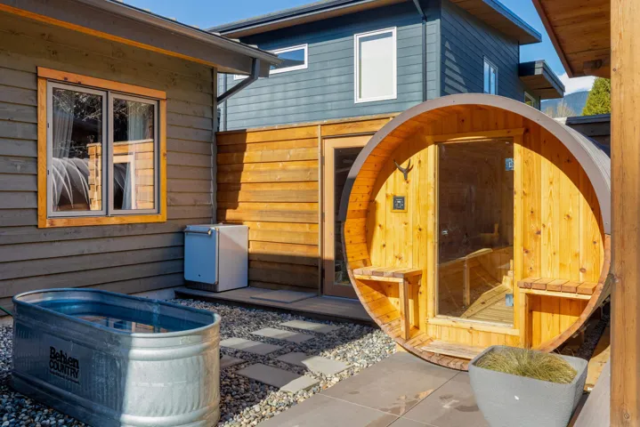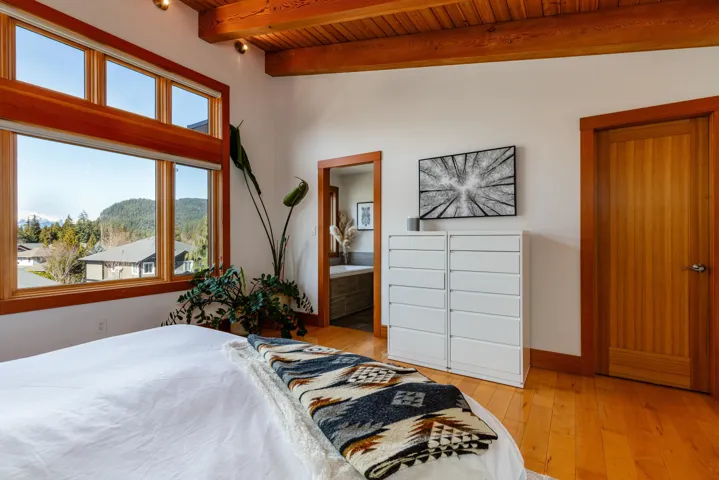 This exquisite 3,101 sq. ft. home is a seamless blend of luxury and thoughtful design. Maple hardwood floors, fir beams, and metal-clad windows create a warm, light-filled ambiance, while over-height doors and ceilings enhance the grand yet inviting atmosphere. The gourmet kitchen boasts custom Merit fir cabinetry, quartz countertops, marble backsplash, and top-tier KitchenAid /Viking appliances. A stunning basalt rock fireplace anchors the living space. Heated floors in the entryway, primary suite, and ensuite add year-round comfort, while a six-zone sound system sets the perfect mood indoors and out. Three spacious decks offer serene outdoor living, surrounded by mature evergreens for ultimate privacy. A separately metered suite provides rental income or guest accommodations.